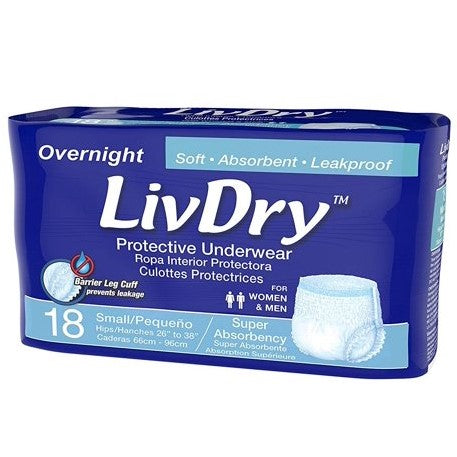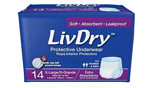 Livdry Overnight Protective Underwear is designed for maximum comfort, ultimate protection, and bedtime-to-rise reassurance. Their proprietary super absorbent gel core quickly locks fluid away, reduces odor, and can handle night bladder incontinence. Livdry Overnight have a soft, cloth-like, latex-free material with a stretch panel that contours to your body for a comfortable fit with leakage barrier leg cuffs and tear-away sides that allow for easy removal.