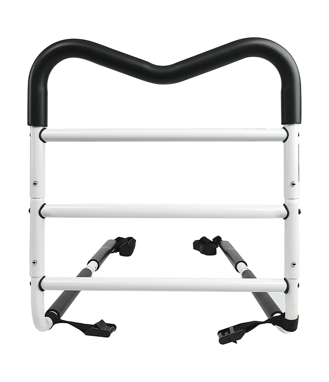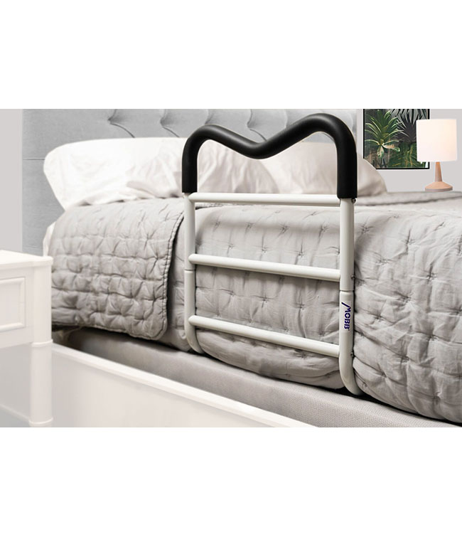 The MOBB Bedrail features an M-shaped design with multiple crossbars that accommodate users of all heights, offering versatile hand positions for safe bed entry and exit. Foam rubber grips provide comfort and security, while adjustable height fits most mattresses. Includes safety straps to secure the rail to your bedframe, an accessory pouch for convenient storage, and requires no tools for quick installation. Supports up to 300 lbs. Ideal for seniors, post-recovery patients, and anyone needing additional mobility support.