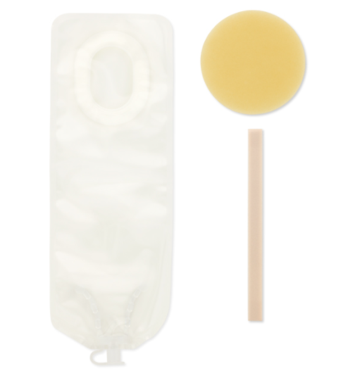 This pouching system is designed for small infants. The skin barrier and pouch are separate and need to be assembled to be used as a one-piece pouching system. The SoftFlex™ barrier is a standard wear skin barrier that is gentle to the skin. The pouch has a drain tap at the bottom which is compatible with a Luer-Lock syringe, which makes emptying easier when drainage is liquid. The bottom of the pouch may be cut off and a soft wire closure can be added at the bottom.
