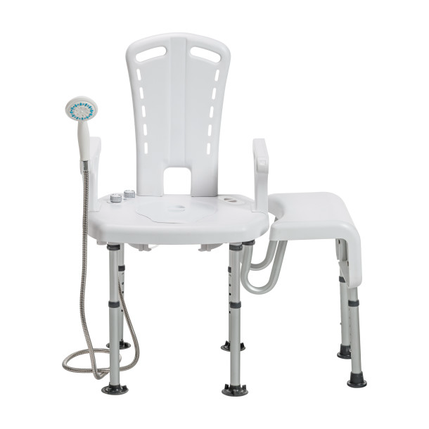 Enhance your Aquachair Bathing System with the bench attachment that makes getting out of the tub easier and safer. The PreserveTech™ Aquachair Transfer Accessory with Curtain Guard allows you to easily slide over the side of the tub without standing. For added protection against slips and falls, its "U" shape cut-out design keeps the shower curtain liner inside the tub to prevent water from spilling during bathing.